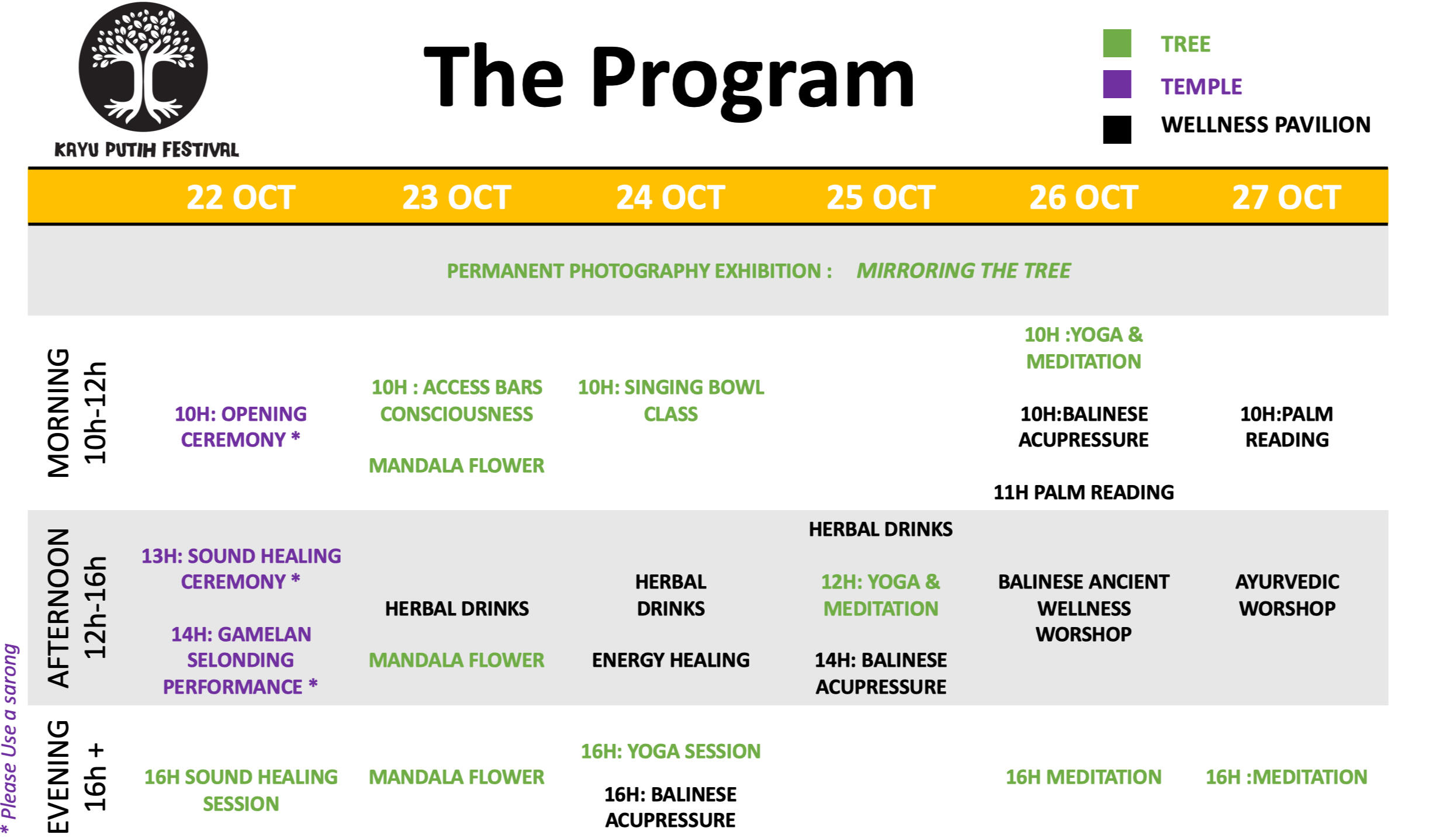 Discover Kayu Putih, Bali's oldest sacred tree, at the heart of a festival that celebrates the connection between nature, art, science, and spirituality. Over 6 days, immerse yourself in a transformative experience: photo exhibitions, spiritual ceremonies, guided meditations, yoga, flower mandalas, plant healing, and much more.Free entrance. Check the program to discover all the events happening throughout the festival.